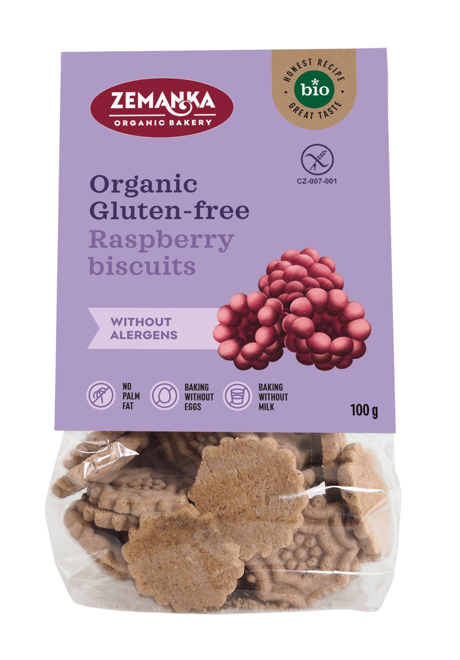 Ekologiški avietiniai sausainiai be gliuteno Zemanka. Lengvi, trapūs ir natūraliai avietėmis kvepiantys sausainiai, pagaminti be jokių alergenų. Be glitimo, be kiaušinių, be pieno ir be palmių aliejaus – puikus pasirinkimas ieškantiems sveikesnio ir švarios sudėties skanėsto. Maloniai saldūs, gardūs ir tinkami visai šeimai.