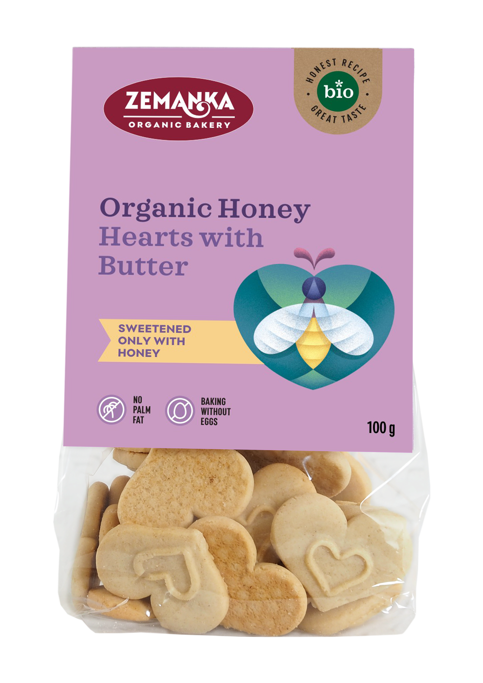 Ekologiški sausainiai širdelės su sviestu ir medumi Zemanka. Švelnaus skonio, trapūs sausainiai, saldinti tik natūraliu medumi. Pagaminti be kiaušinių ir be palmių aliejaus, todėl puikiai tinka ieškantiems natūralesnio kasdienio skanėsto. Mažos širdelės formos sausainiai džiugina tiek vaikus, tiek suaugusiuosius – puikus pasirinkimas prie arbatos ar kaip miela dovanėlė