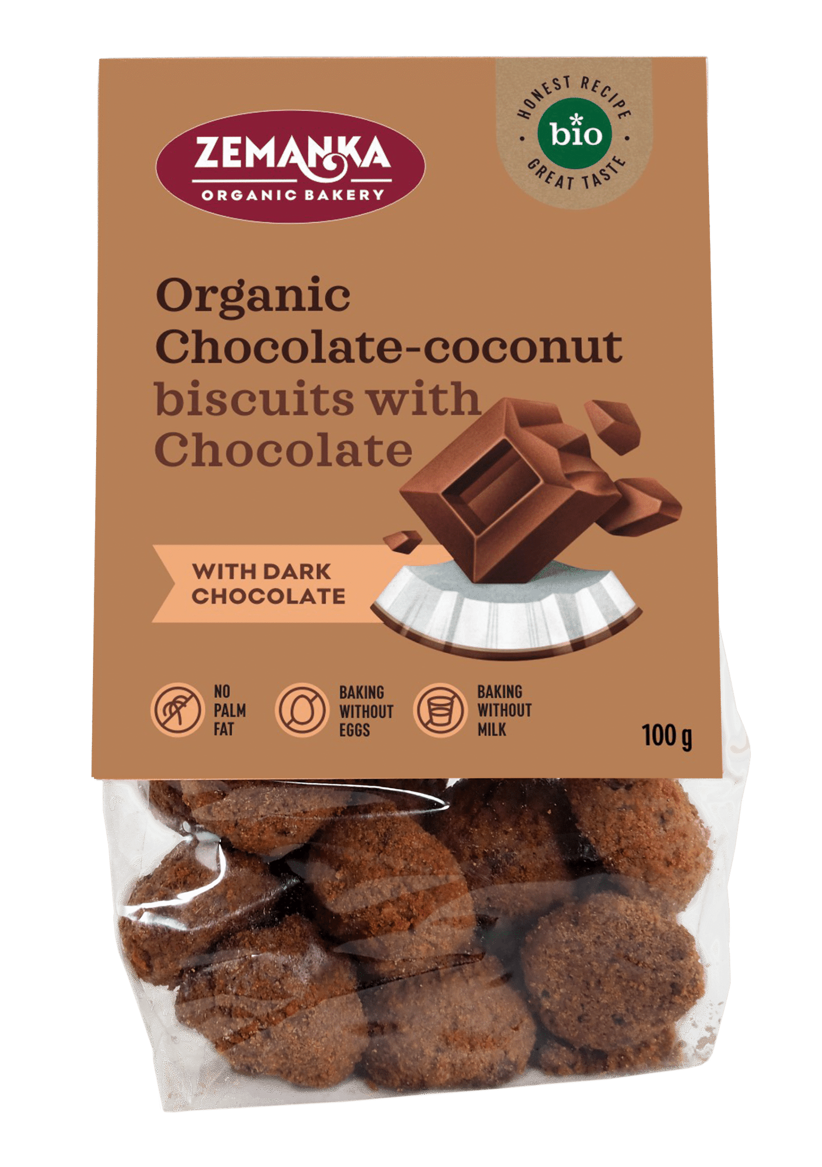 Ekologiški šokoladiniai–kokosiniai sausainiai „Zemanka“. Aromatingi, trapūs sausainiai su kokosais ir tamsiuoju šokoladu. Pagaminti be kiaušinių, be pieno ir be palmių aliejaus. Puikus pasirinkimas ieškantiems natūralaus, sodraus skonio užkandžio su šokoladu.