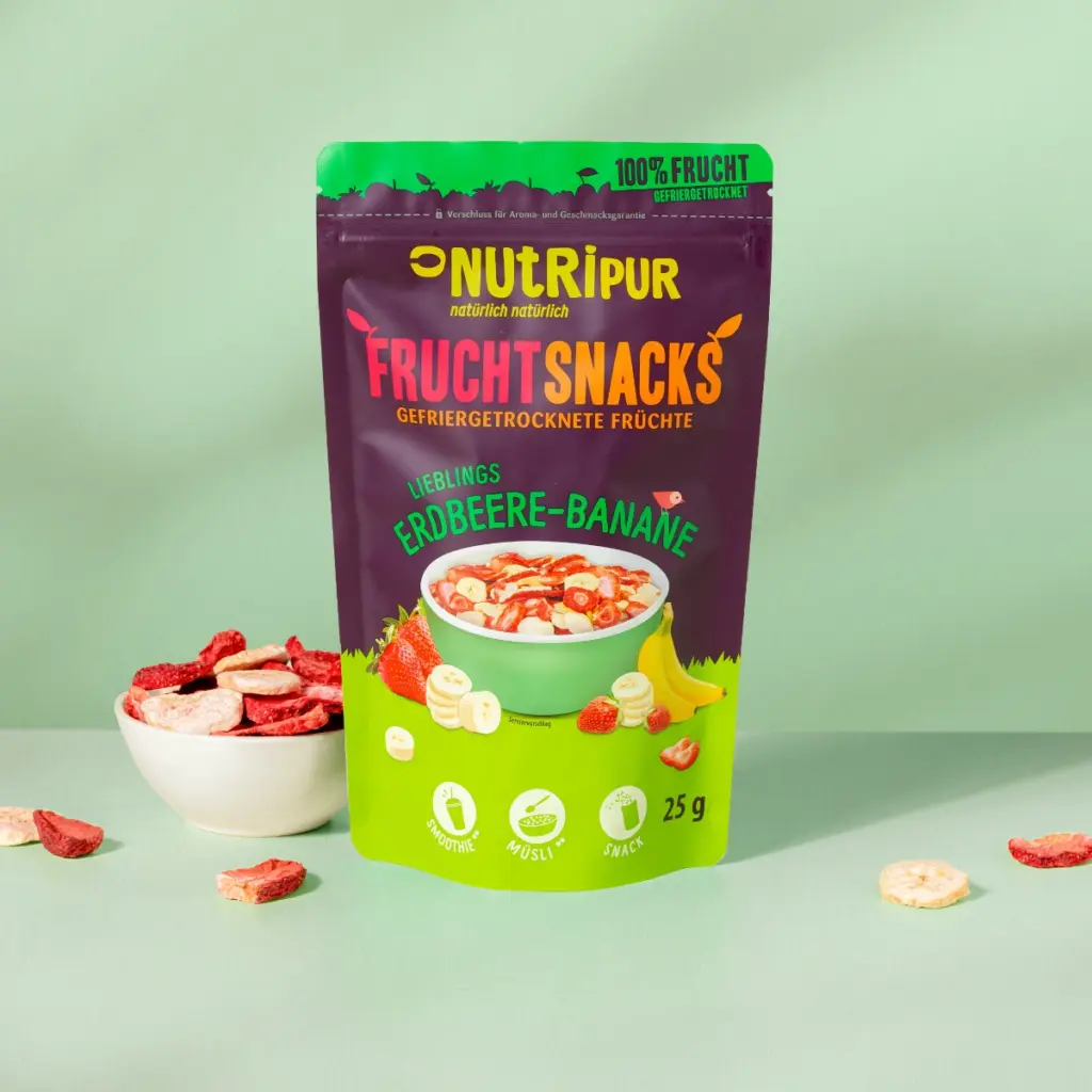 Štai sprendimas – liofilizuoti ekologiški vaisiai, pagaminti tik iš braškių ir bananų. 100 % natūralu, jokių priedų, tik gryna vaisių galia – ir visa tai praktiškoje, daugkartinėje užsegamoje pakuotėje, puikiai tinkančioje pasiimti su savimi kelionėje, darželyje, mokykloje.