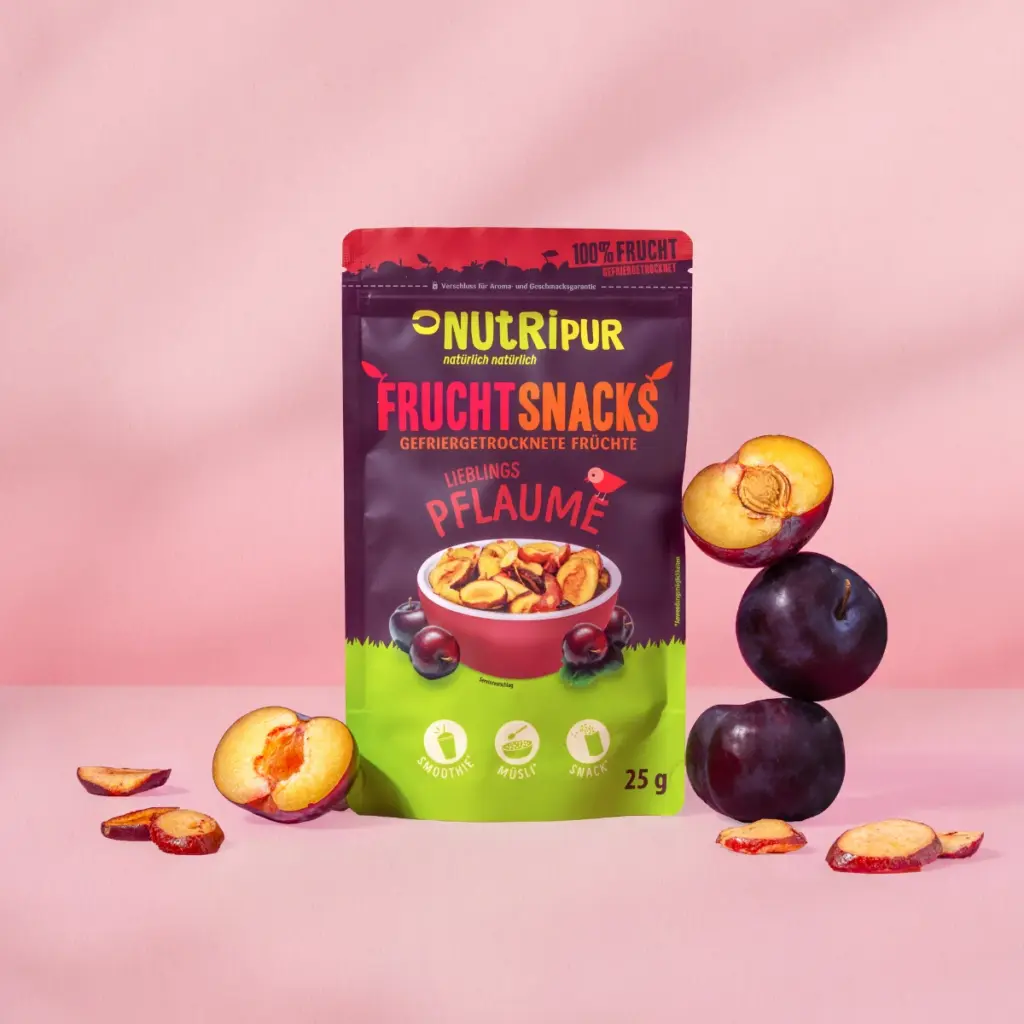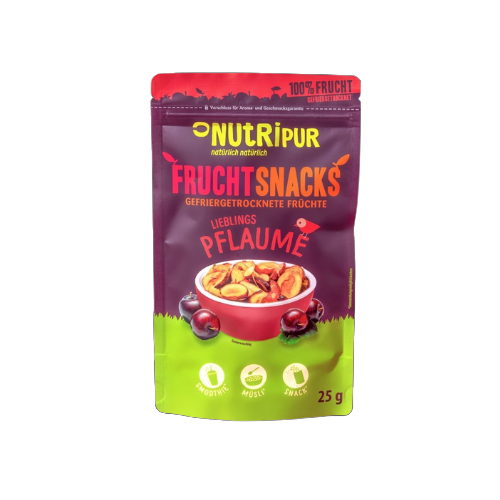 NutriPur šaltyje džiovintos liofilizuotos slyvos. 25 g liofilizuotų slyvų griežinėlių atitinka iki 200 g šviežių vaisių. Žinote tą jausmą? Vaikai alkani, laikas užkąsti – nesvarbu, ar pasivaikščiojus, automobilyje, ar žaidžiant – kyla įprastas klausimas: „Ką galiu duoti savo vaikui greitai, kad būtų ne tik skanu, bet ir sveika?“ O galbūt jūsų vaikas labiau mėgsta saldumynus nei vaisius, ir jūs ieškote sprendimo, kuris būtų toks pat įdomus kaip šokolado plytelė, bet nesukeltų mums kaltės jausmo?